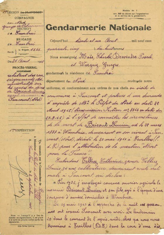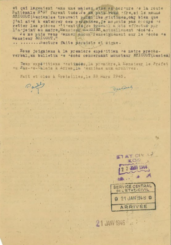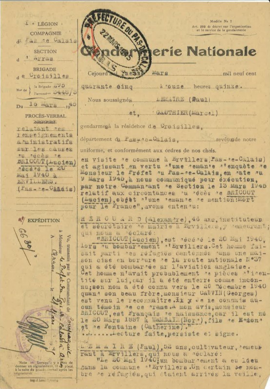 « Le 20 mai 1940, un bombardement a eu lieu dans la commune d’Ervillers. Un certain nombre de réfugiés, qui étaient arrivés la veille, et qui logeaient dans une maison en bordure de la route Nationale N°37 furent tués. Je ne puis vous dire, si le nommé BRICOUT (Lucien) se trouvait parmi les victimes, car bien que j’ai aidé à enterré ces personnes, je ne me suis pas occupé de retirer les pièces d’identité ; ce travail a été effectué par l’adjoint au maire Monsieur MANIER, actuellement décédé. »