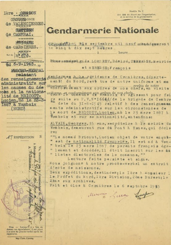 Ces témoignages sont issus du dossier de victime civile de Lucien Bricout. En 1945, son beau-frère qui s’occupait de ses trois enfants mineurs, avait sollicité la reconnaissance de son décès comme « Mort pour la France ». Ensuite il a entrepris les procédures pour que ces neveux soient reconnus pupilles de la Nation.