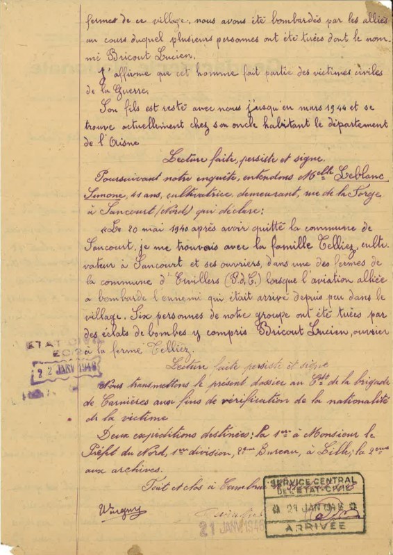 « Le 19 mai 1940, à l’approche de la nuit, ces personnes ont évacué Sancourt avec moi. Le lendemain 20 dans le courant de l’après-midi, alors que nous nous trouvions à Ervillers (Pas de Calais) dans la cour d’une des fermes de ce village, nous avons été bombardés par les alliés au cours duquel plusieurs personnes ont été tués… »