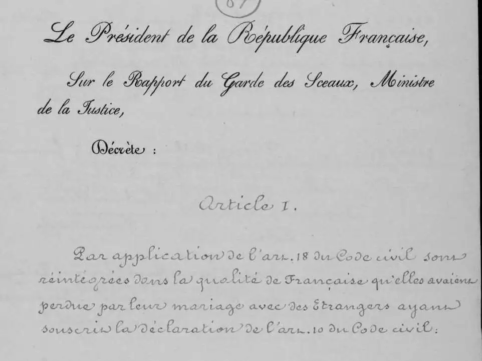 La réintégration permet à un Français de recouvrer la nationalité française qu’il avait précédemment perdue, comme cela arrivait aux femmes françaises qui épousaient un étranger. Une réintégration suite à un veuvage : Marie Baptistide Monceau épouse Antoine Marie Restieaux en 1883 à Laval. La jeune femme de 24 ans est née à Laval, son pèreLireLire la suite « Naturalisation : la réintégration des Françaises »