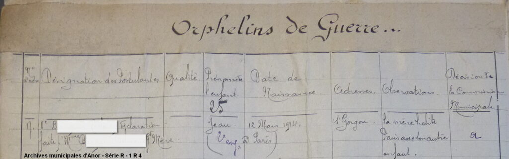 Le dossier intitulé « pupilles de la Nation : demandes d’adoption », conservé aux archives communales, nous apprend entre autres, que c’est la grand-mère paternelle qui s’est chargée de faire la demande d’adoption. Elle s’occupe de Jean, pas encore scolarisé. Sa belle-fille est à Paris avec Marie.