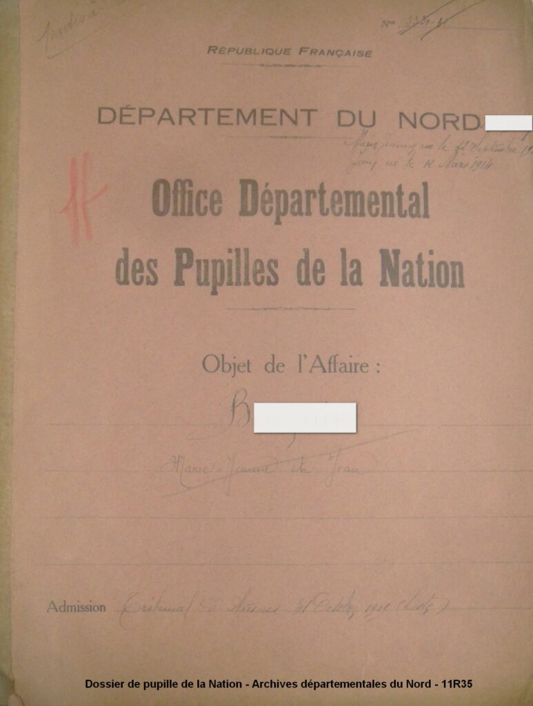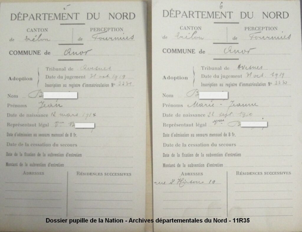 Le dossier de pupille de la Nation est conservé par les archives départementales du Nord, (Série R, cote 11 R 35). Il est composé des fiches identifiant les bénéficiaires, ici Marie et Jean portant les matricules 3330 et 3331 (identiques à ceux de la page de garde du dossier), leur état civil, leur représentant légal, et leur adresse. On doit aussi y trouver une copie du jugement, malheureusement celles de l’année 1919 sont lacunaires.