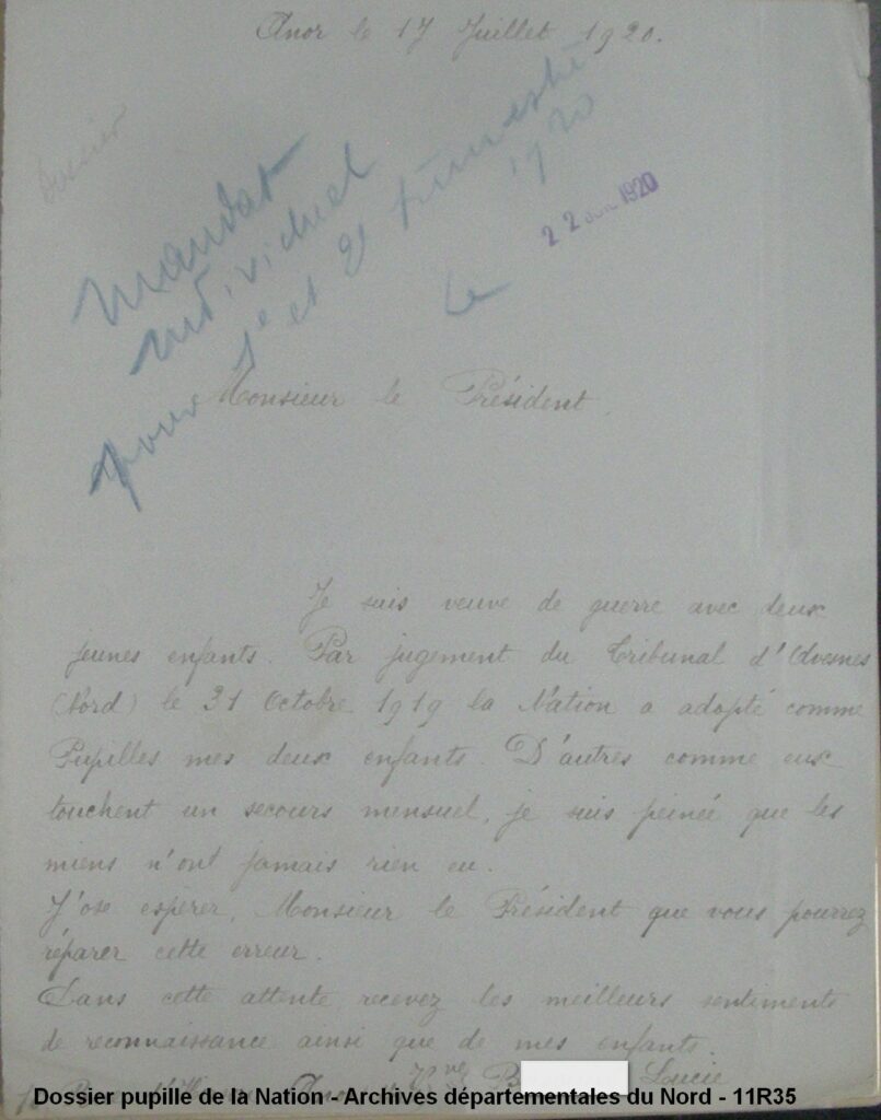Ces dossiers contiennent les relevés des pensions ou frais engagés pour les pupilles, ceux-ci permettent d’apprendre où et comment ont été élevés ces enfants. Les échanges de courriers entre Office Départemental des Pupilles de la Nation et les tuteurs sont aussi conservés. Dans ce dossier, un premier courrier écrit par la mère, daté de juillet 1920, nous apprend qu’elle ne perçoit pas de « secours » (aide financière). Deux mandats lui sont envoyés pour réparer cet oubli, comme on peut le voir noté au crayon bleu en haut du courrier.