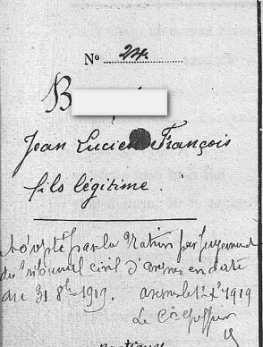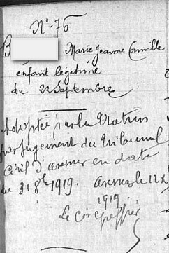 Le dossier intitulé « pupilles de la Nation : demandes d’adoption », conservé aux archives communales, nous apprend entre autres, que c’est la grand-mère paternelle qui s’est chargée de faire la demande d’adoption. Elle s’occupe de Jean, pas encore scolarisé. Sa belle-fille est à Paris avec Marie.