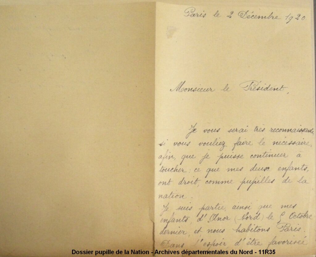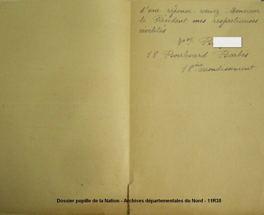 Dans le courrier suivant, la mère signale son déménagement à Paris et demande à pouvoir continuer à bénéficier des aides pour ses enfants. Son dossier est transféré au département de la Seine.