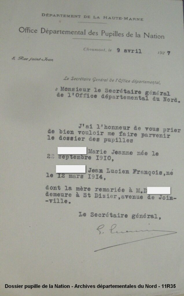 Quelques années plus tard, la famille déménage à Saint-Dizier suite au remariage de la mère avec M. D. En 1927, l’office Départemental des Pupilles de la Nation de la Haute-Marne demande, à celle du Nord, le transfert du dossier des enfants Marie et Jean B., mais il n’est plus dans le Nord depuis le 9 décembre 1920.