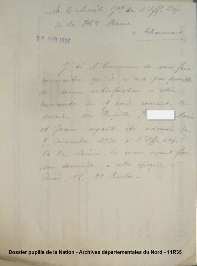 La recherche des dossiers de Marie et Jean à Paris et en Haute-Marne est restée infructueuse. En effet, les archives départementales de la Haute-Marne ne l’ont pas retrouvé et les dossiers des pupilles de la Nation de Paris de 1918 à 1944 ont été détruits dans l’incendie du Fort Montlignon. Néanmoins, ce dossier a permis de connaître différents domiciles de la famille B, informations précieuses en l’absence de recensement.