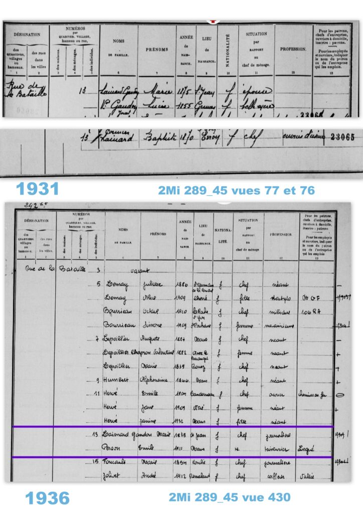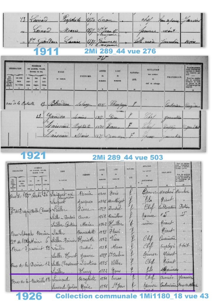 Exemple d’une maison en Sarthe au 13, rue de la Bataille au Mans. Les recensements des années 1911 à 1936 nous apprennent que la même famille a résidé dans cette maison durant plus de 25 ans : Baptiste Lainard (né à Evron en Mayenne), sa femme Marie Gandon (née à St Jean de Mayenne). La belle-mère de Baptiste Lainard habite avec le couple jusqu’en 1931, elle se prénomme Louise ou Lucie. En 1936, Marie a 61 ans, elle est journalière et partage le logement avec Emile Person, teinturier, âgé de 25 ans, sa mère est certainement décédée et peut-être aussi son mari, il est possible de vérifier en consultant les mentions marginales sur leurs actes de naissance.