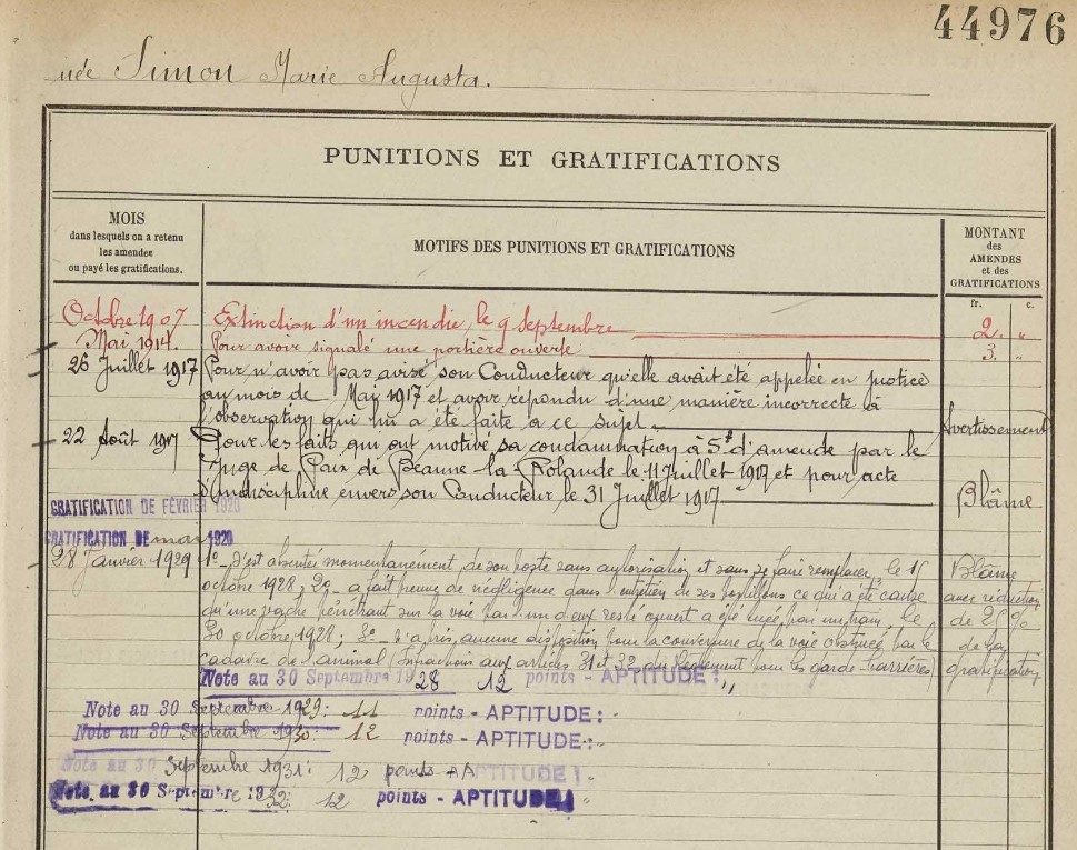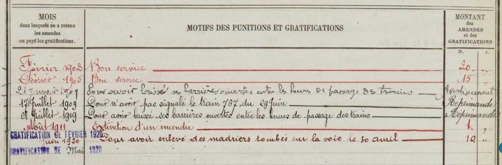 C’est en mars de 1917 que Marie prend le poste de garde-barrière du passage à niveau N°66 d’Auxy. Quatre mois plus tard, Marie reçoit un avertissement puis un blâme car ayant été condamnée par le tribunal deux mois plus tôt, elle aurait dû avertir son supérieur. Elle n’a pas su répondre correctement lorsque celui-ci lui en a fait la remarque.