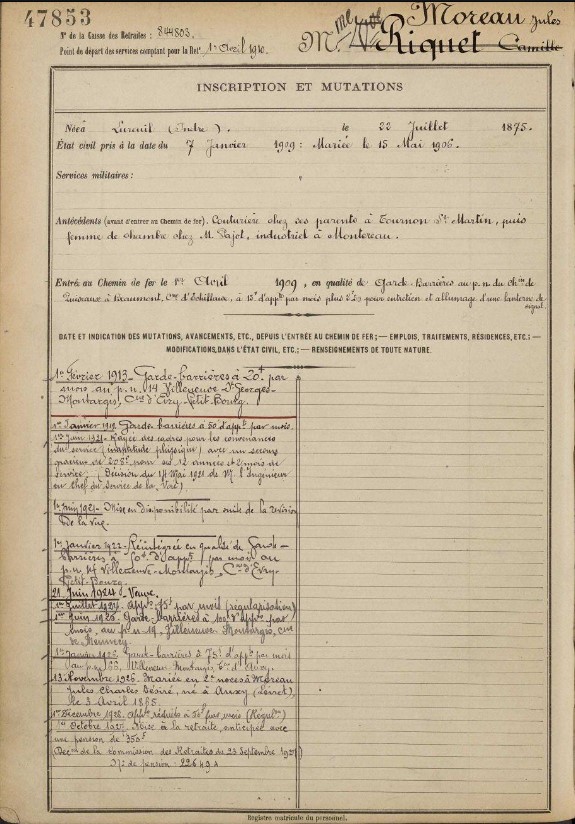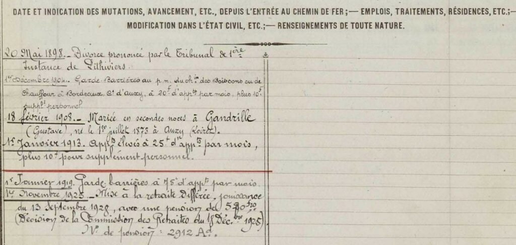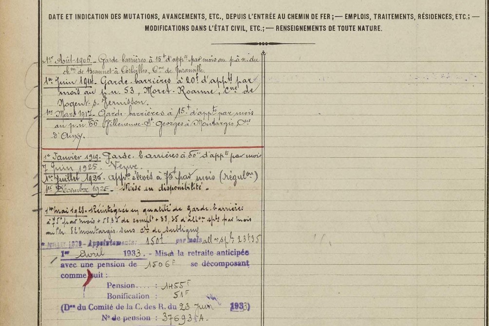 Voici les fiches matricules de quelques gardes-barrières d’Auxy dans le Loiret. Ce village est traversé par la ligne de chemin de fer de Villeneuve-Saint-Georges à Montargis, aujourd’hui désaffectée, on peut encore voir l’emplacement des huit passages à niveau. Certains étaient gardés par des garde-barrières. Ces femmes s’assuraient que personne ne traverse la voie au moment du passage d’un train, pour cela elles fermaient les barrières et les portillons dont elles étaient chargées de l’entretien. Ce métier les contraignait à être présentes à chaque passage de train, en cas d’absence elles devaient prévenir leur supérieur pour être remplacée. Les registres nous apprennent que certaines n’étaient pas toujours consciencieuses, tandis que d’autres étaient récompensées pour avoir évité des accidents.