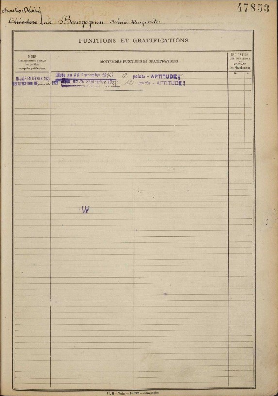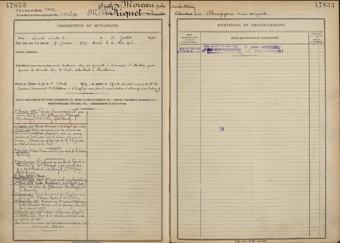 La page de gauche reprend l’état-civil et les antécédents du salarié. Ensuite l’évolution de carrière est détaillée ainsi que les salaires et les résidences successives jusqu’à la retraite ou au décès du salarié. En cas de départ avant la retraite le motif est notifié. Les « punitions et gratifications » sont inscrites sur la page de droite. Ces registres sont disponibles sur le site des Archives Nationales du Monde du Travail (ANMT)