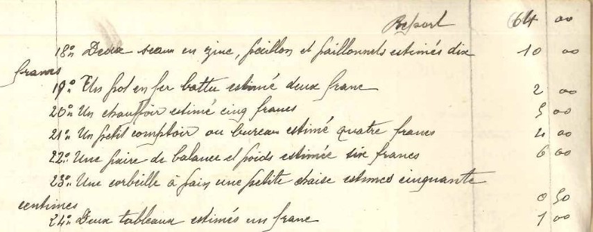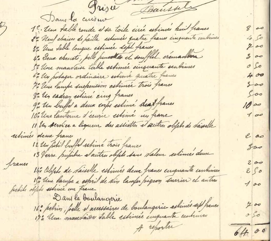 Le six décembre 1909 à neuf heures du soir, Jean décède à son domicile. Héloïse est veuve à trente-quatre ans. Marguerite et Maurice ont quatorze et dix ans. Trois mois plus tard, le notaire passe à la boulangerie pour faire un inventaire et estimer les biens. Les enfants sont les seuls héritiers, Héloïse est usufruitière. Ce document détaille tout ce que le couple possède.
