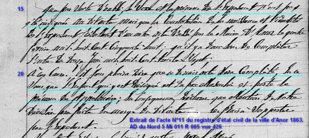 Cet acte nous apprend (lignes 5 à 9) qu’Appolinaire Lécoyer est né le 12 juin 1837 (exactement la même date que Victoire Josephe) à Anor comme il en résulte de l’acte de naissance, et à partir de la ligne 9 on peut lire : « quant au prénom et au sexe […] d’un jugement rendu le dix sept janvier dernier par le tribunal civil d’Avesnes » soit 15 jours avant le mariage. En reprenant le registre d’état civil d’Anor, la transcription de 84 lignes du jugement apparait le 27 janvier 1863, en voici deux extraits :