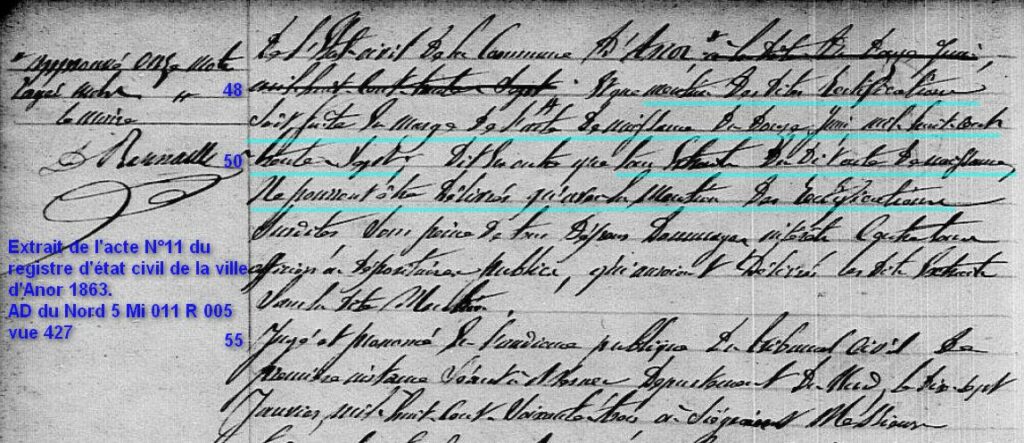 Le deuxième extrait nous informe à partir de la ligne 48 : « que mention des dites rectifications soit faite en marge de l’acte de naissance du douze juin mil huit cent trente sept », ainsi tous les extraits d’acte de naissance d’Appolinaire Lécoyer seront délivrés avec cette mention sous peine de dommages et intérêts. Ceci n’a visiblement pas été fait sur le registre numérisé par les archives départementales du Nord. Appolinaire Lécoyer aura attendu l’âge de 27 ans et 7 mois pour avoir officiellement un prénom et un sexe!