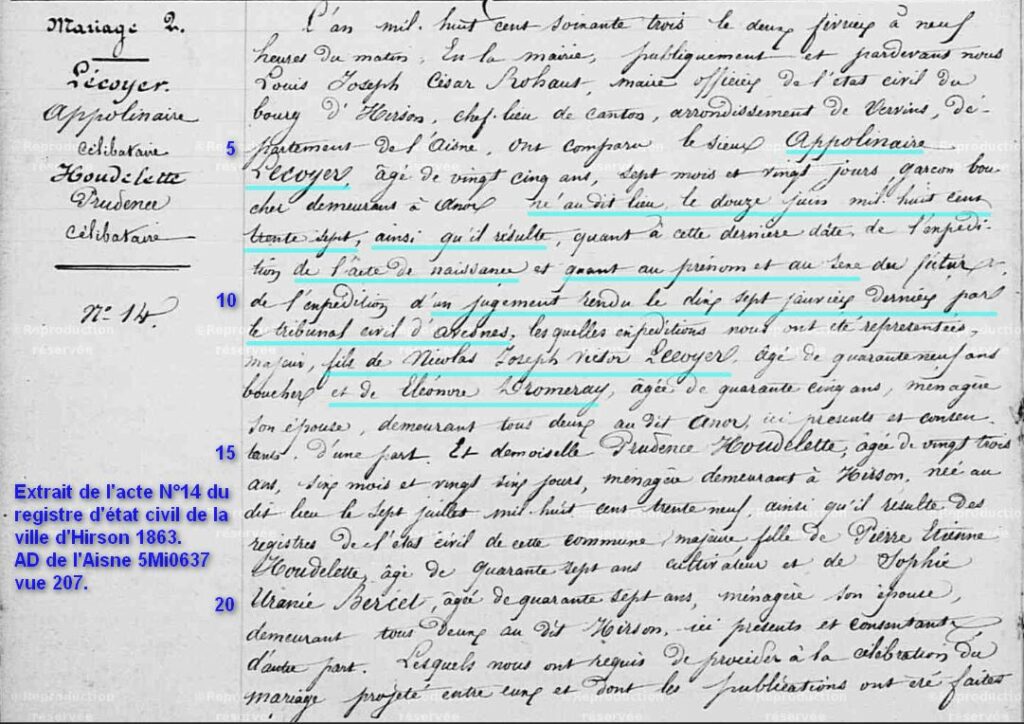 Pour savoir si Victoire Josephe était nommé Appolinaire ou si ce sont deux personnes différentes, il faut retrouver un des deux actes de mariage. Traditionnellement les futurs époux se marient dans le village de la jeune fille, espérons que l’un des 2 mariages ait été célébré à la mairie d’Anor. Je « dépouille » donc les actes de mariages d’Anor : rien. Je cherche dans les actes de décès et je retrouve celui de sa 1ère femme, décédée le 16 décembre 1871 à Anor à l’âge de 29 ans. L’acte nous apprend qu’elle est native d’Hirson dans l’Aisne, où ses parents résident encore. C’est aux archives départementales de l’Aisne que je retrouve cet acte de mariage daté du 2 février 1863 :