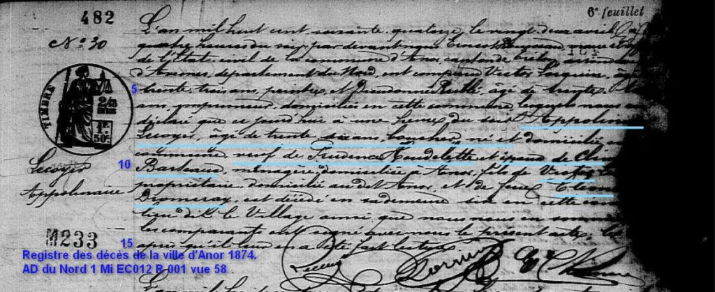 Poursuivant mes recherches aux archives départementales du Nord, j’ai trouvé l’acte de décès en 1874 d’un fils de Victor Lécoyer et Eléonore Dromeray nommé Appolinaire, âgé de 36 ans (donc né vers 1838 comme Victoire Josephe, l’enfant asexué). Sur cet acte on lit qu’il est natif de la commune d’Anor où il résidait et exerçait le métier de boucher. Il était veuf de Prudence Houdelette et remarié avec Clém… Barteaux.