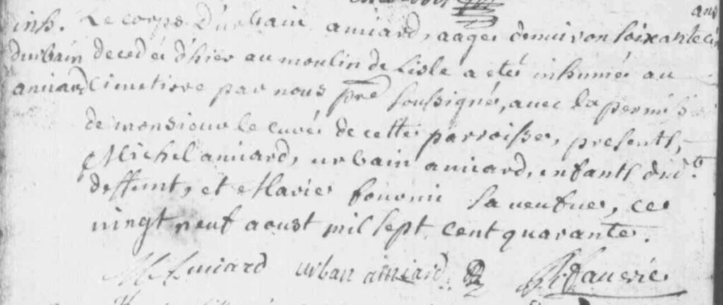 Urbain Amiard est né à Aron en 1676. Sa femme Marie Fourmy est née en 1688 à Saint-Fraimbault-de-Prières, le couple s’y marie le 25 novembre 1706. Il s’installe d’abord à Mayenne où vit encore la mère d’Urbain, c’est là que leur premier enfant nait : Marie, puis en 1710 le couple vit à Saint Fraimbault-de-Prières où Marie Fourmy donne naissance à un premier fils nommé Michel. Leur troisième enfant voit le jour en février 1720 à Oisseau, il porte le prénom de son père et celui de son parrain : Urbain-Etienne. Ces déplacements sont certainement liés à la profession de meunier, que Michel et Urbain-Etienne pratiqueront. Urbain Amiard décède au moulin de Lisle le 28 août 1740, âgé de 64 ans. Le lendemain, sa veuve, ses fils Michel et Urbain assistent à son inhumation au cimetière de la paroisse de Saint-Fraimbault. Suite à la disparition de son mari, Marie Fourmy continue d’occuper le moulin de Lisle et un autre meunier, François Taburet, vient s’installer à la Saint Georges de 1741, après avoir signé un bail en septembre 1740.