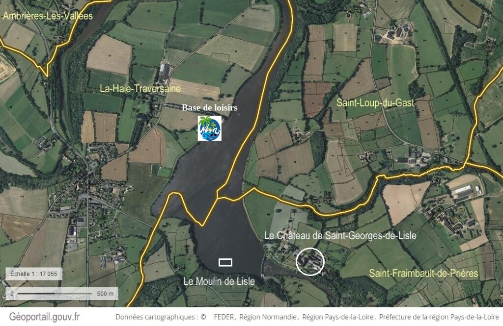 Le lac de Haute Mayenne, d’une superficie d’environ 123 hectares, s’étend sur près de 6 kms sur les communes d’Ambrières-les-Vallées, la Haie-Traversaine, et sur la rive gauche : Saint-Fraimbault-de-Prières et Saint-Loup-du-Gast. Ce lac est alimenté par les eaux de la Mayenne, de la Colmont, de la Varenne et celles des ruisseaux du Pontceau et du Pigray. C’est une retenue d’eau artificielle, en forme de bottine, créée suite à la construction du barrage de Saint-Fraimbault-de-Prières sur la Mayenne. D’une longueur de 210 mètres et d’une hauteur maximum de 15,5 mètres, le barrage a été inauguré le 14 octobre 1978 après 3 années de travaux. Outre la construction du barrage, il a fallu relever les futures berges du lac et aussi démonter plusieurs bâtiments tous situés sur la commune de Saint-Fraimbault-de-Prières dont le moulin de Lisle, l’habitation de la Lavanderie et la ferme de l’Epinay. Six ans après la mise en eaux, une centrale électrique est construite.