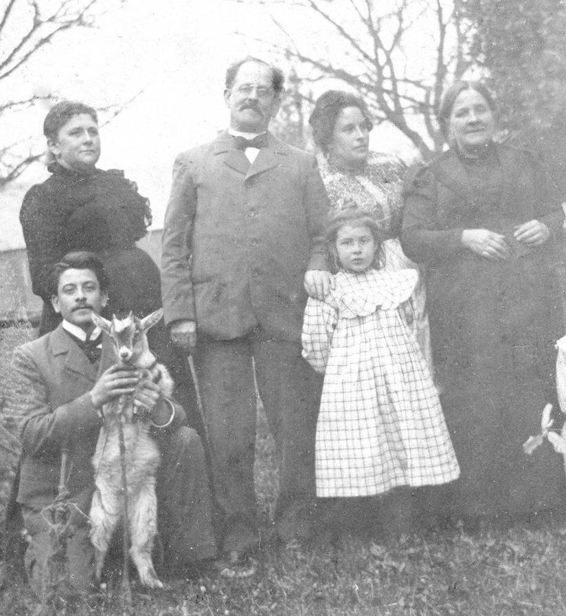 De gauche à droite : Paul Brihaye (à genoux), Emma Brihaye, Charles Brihaye, Marcelle Francq, inconnue, Sydonie Lécoyer. 1901. Collection personnelle L. Decroix