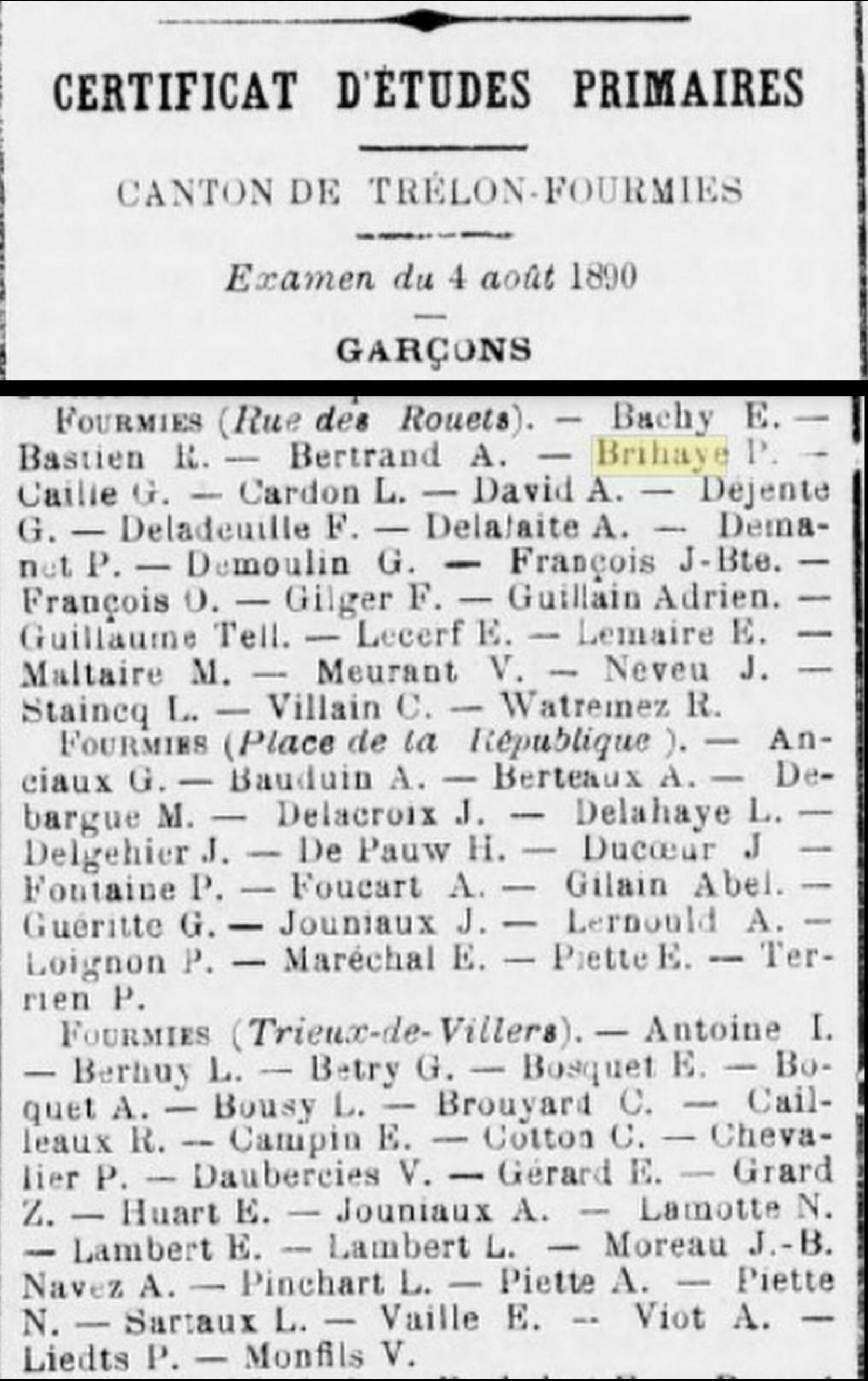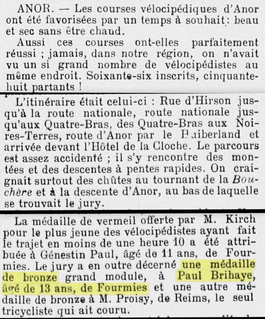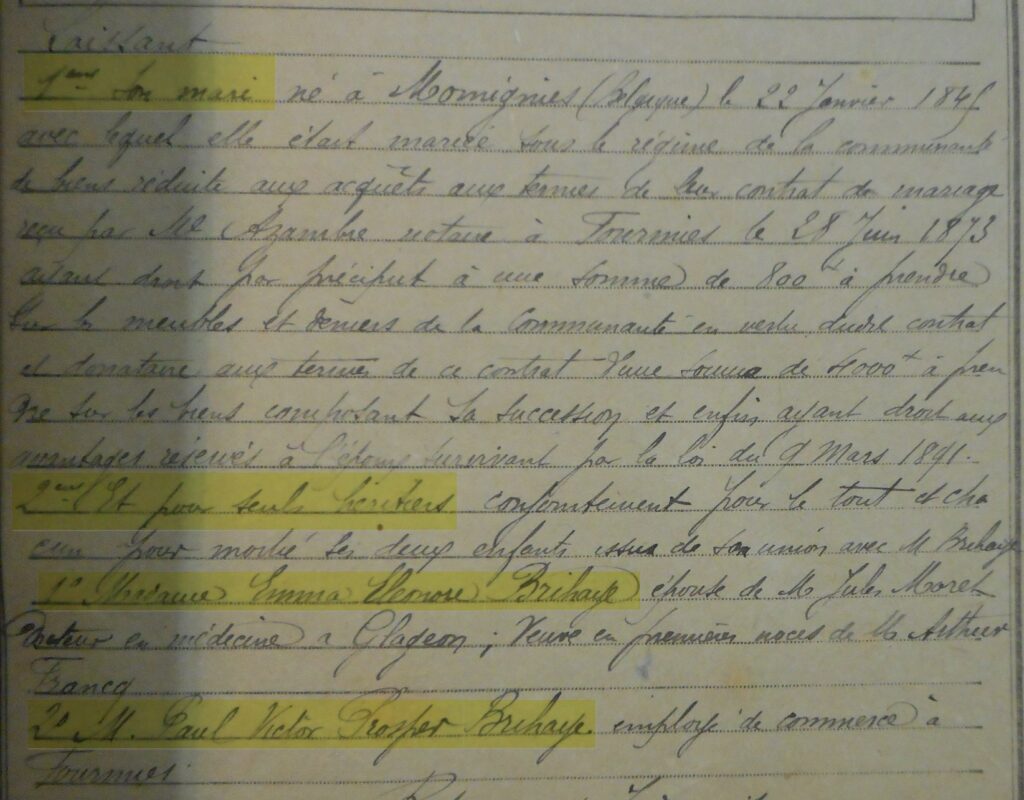 Le 1er juillet 1873, à Anor, village de l’Avesnois, Sydonie Lécoyer, sœur de Mathilde (Lien vers la généalogie Lécoyer) épouse en seconde noce Charles Brihaye. Le couple s’installe à Fourmies, petite ville du Nord, où les industries de textile font vivre toute la famille Brihaye : Charles est comptable chez un négociant en laine, son frère Aimé contre-maître de filature, un autre directeur de filature et l’aîné est aubergiste après avoir été fileur de laine. Après trois années de mariage, ils deviennent propriétaire d’une maison et d’un terrain de quatre ares aux N°24 et N°26 de la rue des Rousseaux au centre de la ville. Sydonie met au monde quatre enfants, seuls Emma et Paul atteignent l’âge adulte. Ce dernier, né 2 ans après sa sœur, le 17 octobre 1878, porte aussi les prénoms de ses deux grands-pères : Victor et Prosper.