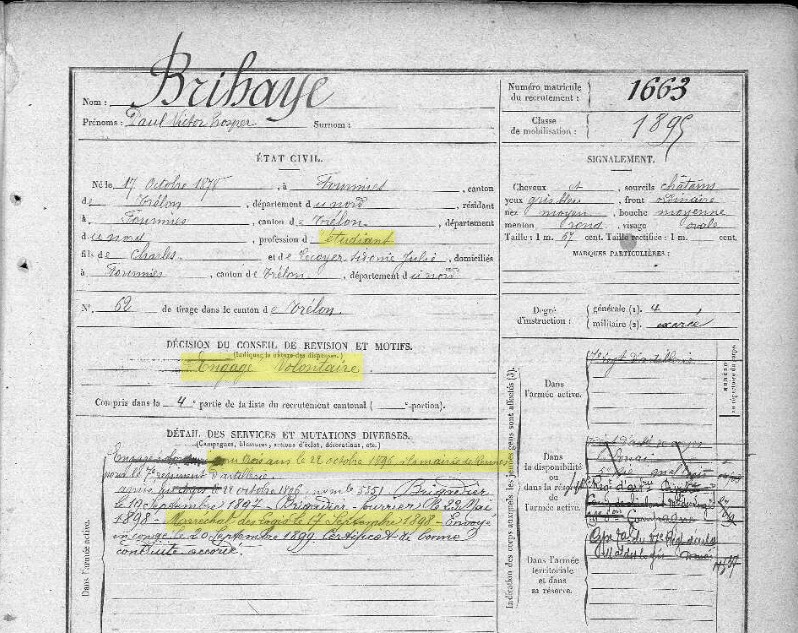 A dix-huit ans, Paul, du haut de son mètre 67 se présente à la mairie de Rennes, capitale de la Bretagne, le jeune homme aux yeux bleus s’engage pour trois ans dans le 7ème régiment d’artillerie en garnison dans cette ville. La présence de Paul à Rennes peut s’expliquer ainsi : Son cousin germain Louis Bryhaie, dont l’orthographe du patronyme a été modifiée à l’état civil lors de sa déclaration de naissance, est négociant à Rennes et il gagne régulièrement les adjudications pour la fourniture de l’épicerie auprès du 7ème régiment d’artillerie au camp de Coëtquidan.