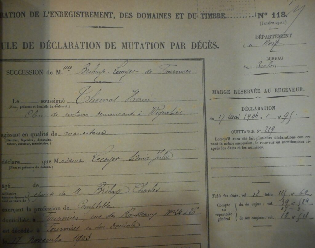 En mai 1904, Charles et ses deux enfants prennent connaissance de la succession de leur épouse et mère : Sydonie Lécoyer. Celle-ci avait hérité de son père, Victor Lécoyer, un ensemble de biens immobiliers à Anor : celui-ci constitue l’héritage des enfants estimé à 50000 Francs, le mari bénéficie de l’usufruit de la demeure de Fourmies acquise pendant le mariage, cette maison est estimée à 10000 Francs.