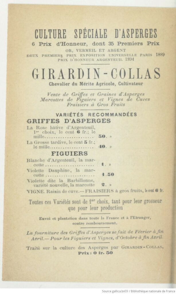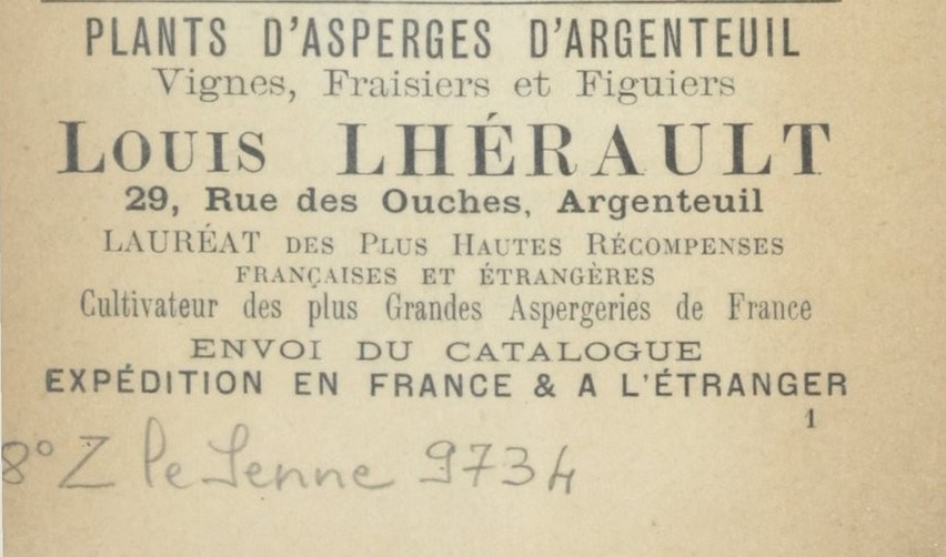 En effet, depuis le début du XIXe siècle, une asperge dénommée « d’Argenteuil » existe grâce aux efforts de plusieurs producteurs. Ceux-ci ont amélioré la variété de grosse asperge de Hollande en développant, dans un premier temps, une variété hâtive, suivie d’une variété tardive. Ces cultivateurs ont également eu l’ingénieuse idée de faire pousser l’asperge entre les rangs de vignes. Certains d’entre eux ont participé à des concours, remportant des prix prestigieux, et ont ainsi été élevés au rang de Chevalier du Mérite Agricole, contribuant à la renommée de l’asperge d’Argenteuil.